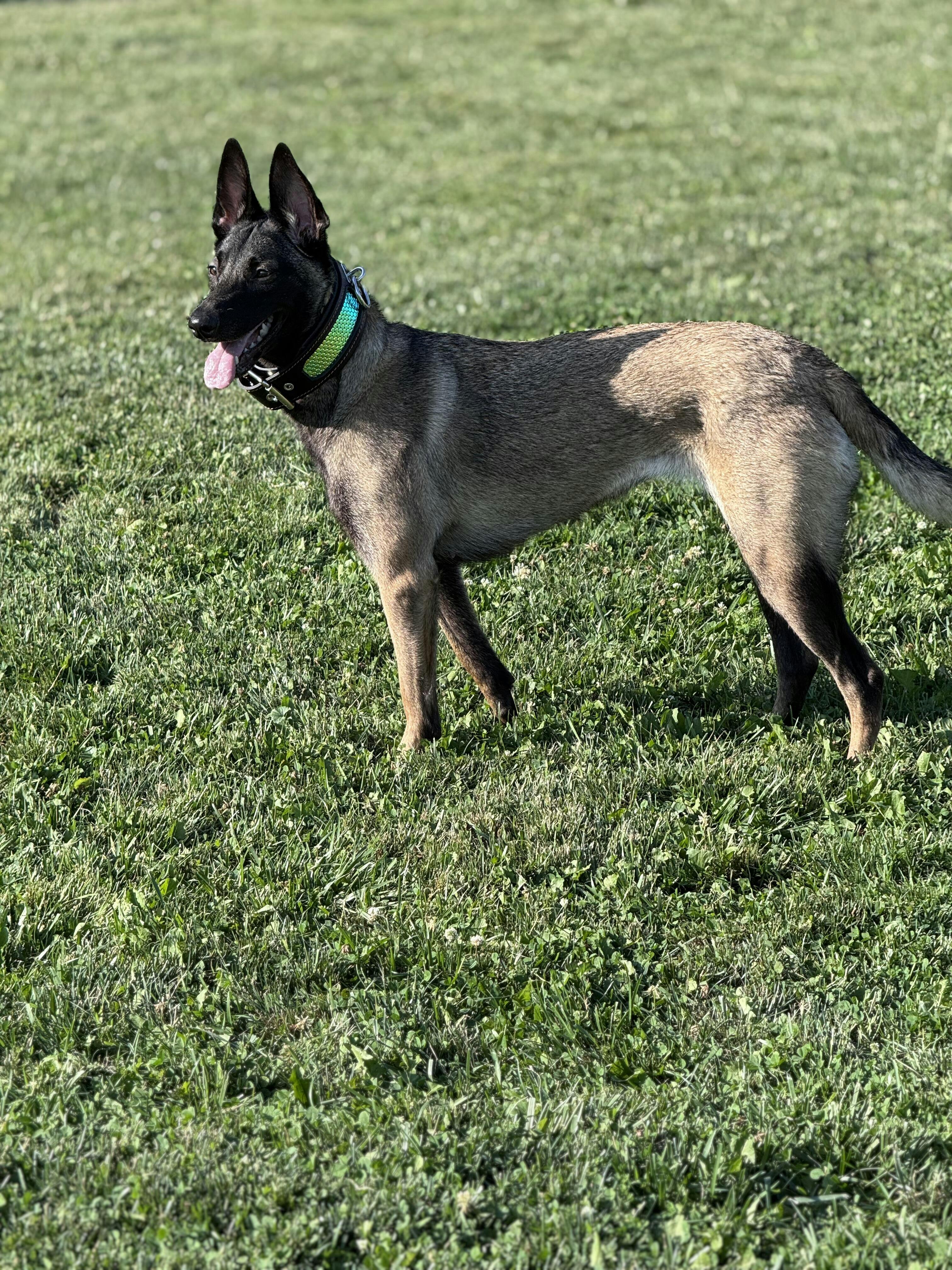 I am absolutely in love with this collar - the color shift leather inlay really makes for a fabulous contrast with my dog’s sable coat, and she has gotten loads of compliments on how it looks on her. The leather is sturdy, but the padding makes it soft and comfortable against her neck. I can’t say enough good things about the look and quality of this collar!